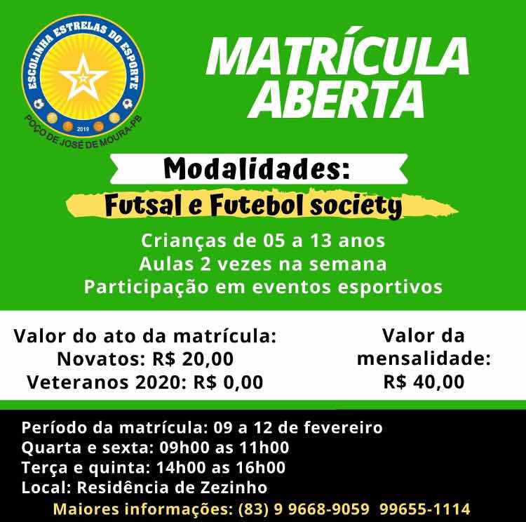 A Escolinha Estrelas do Esporte do Prof° José Orlando (Zezinho) de Poço de José de Moura está de volta. Após ficar fechada as portas da escolinha por conta da pandemia, o professor José Orlando espera ansiosamente voltar aos trabalhos com as crianças nas modalidades de Futsal e Society, o mesmo divulgou hoje que estará abertas as matrículas para os atletas entre 05 e 13 anos.